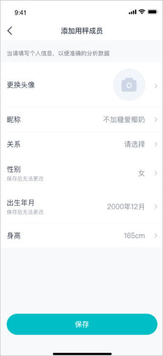 3、填写成员信息(注意性别和出生年月保存后无法更改),填写完成后点击“保存”