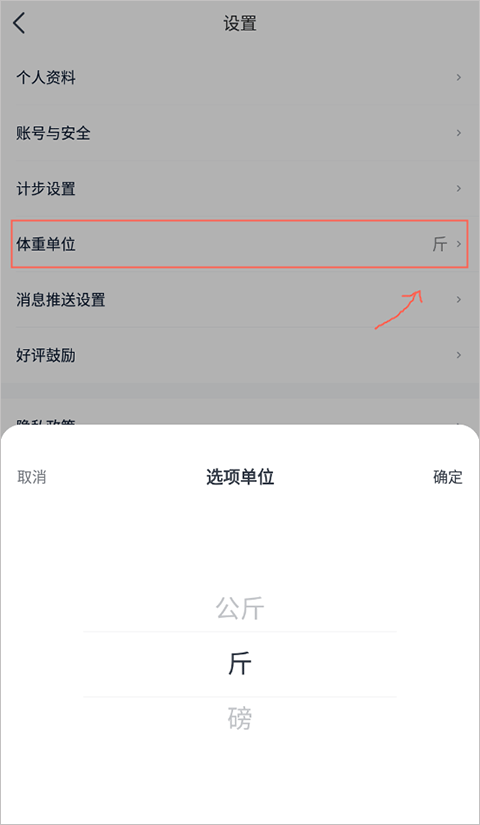 2、接着点击其中的“体重单位”即可设置成公斤了。