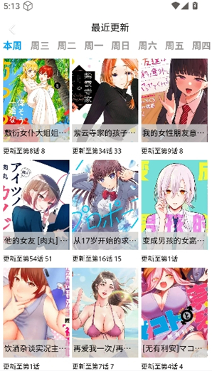 3、我们点击“最近更新”,在这里可以看到最近一周内上线的新漫画