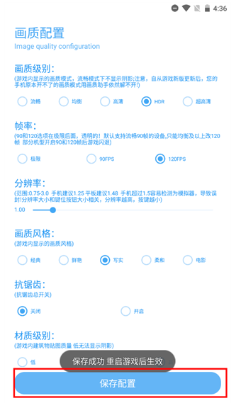 4、选择好自己想要的配置,点击“保存配置”,重新打开游戏即可