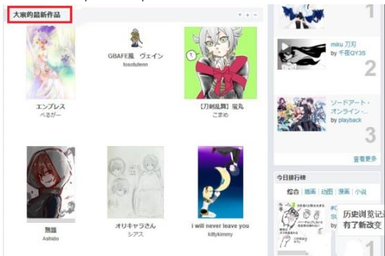 然后你进入自己的主页后,往下拉看到这个有一块很大的地方是《大家的新作品》,随便点一个人的进去。