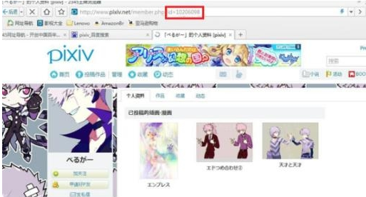 4、在网址中把随机选择的画师的id删了换成你要找的画师的id。敲回车键(enter键)。