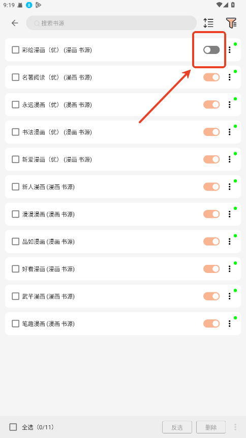2、书源右侧的开关按钮,开启即可。