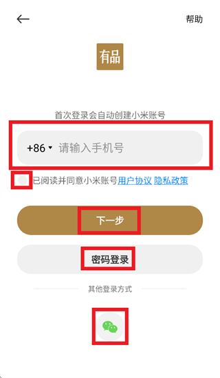 跳转至登录界面后,输入手机号,勾选已阅读并同意小米账号用户协议隐私政策,点击下一步获取验证码登录即可,还可以点击密码登录,使用邮箱/手机号码/小米ID,密码登录使用,以及点击下方微信图标,使用微信账号第三方授权登录