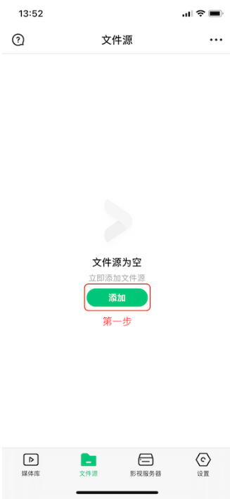 第一步:初次进入VidHub App后可以看到“媒体库”的添加按钮,点击“添加”按钮。