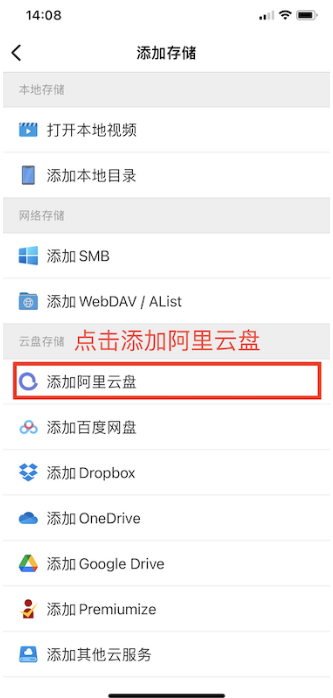 第二步:点击“添加”按钮后在点击添加存储会跳转到添加存储页面,这里拿阿里云盘做示范。