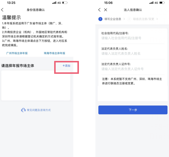 2、仅联络员可为市场主体填报年报。如果系统内没有显示所需年报的市场主体,点击【添加】,提交相关信息后,即可成为联络员。