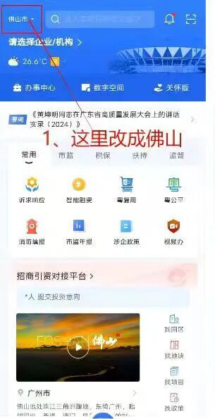 打开粤商通app,进入后界面左上角地址选择地址,例如“佛山”