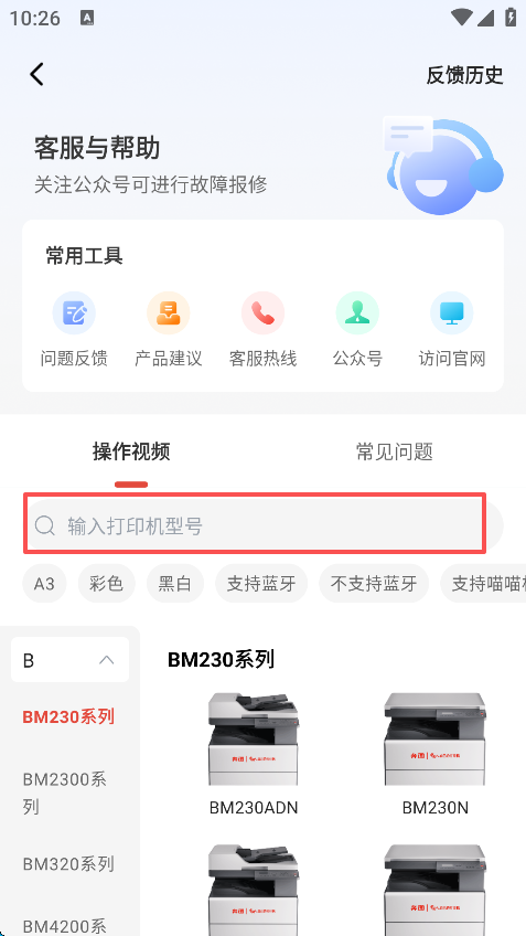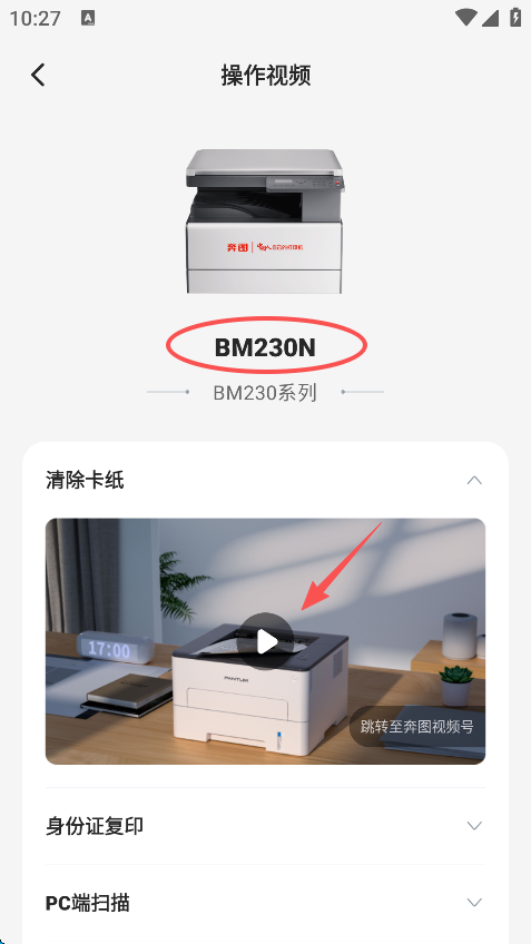 4、确认型号没有问题,随后便可以查看各种详细视频了,有“清除卡纸”,“票据复印”,“切换纸盒设置”等多种视频教程,清晰明了。