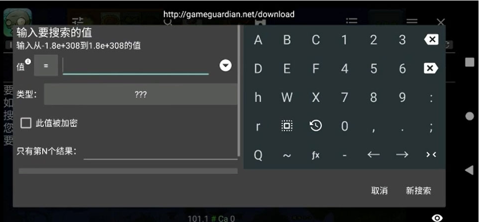 4、接着GG修改器进入搜索界面,它会指引你如何根据你掌握的信息,去寻找你想修改的那个数据(比如阳光、金币、冷却时间)
