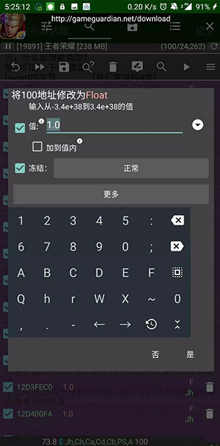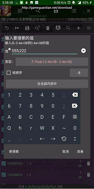 当我们需要搜索两个数据的时候,一个一个搜索起来的话数值会很多,容易奔溃,那么我们就可以用到联合搜索,比如生命值是555,攻击力是222,那么我们就在搜索面板输入555;222,就是一个数值加一个分号然后再加另一个数值,分号在搜索面板有。