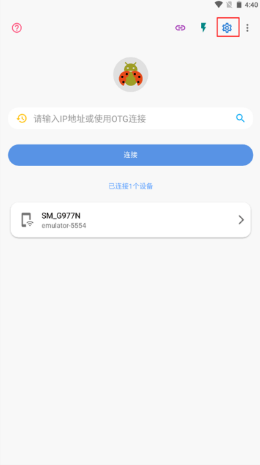 (1)打开甲壳虫adb手机助手app,并点击右上角的“设置”按钮进入到设置选项界面。
