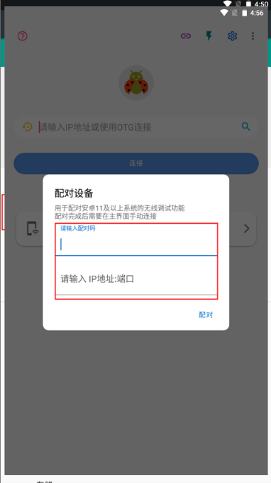 5、也可以点击“使用配对码配对设备”,然后点击甲壳虫ADB助手中的“连接按钮”使用配对码进行连接。