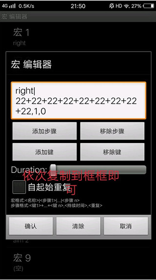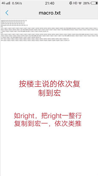 9、将文件里的指令内容按类别复制,例如把整条“right”指令复制到宏一,以此类推。