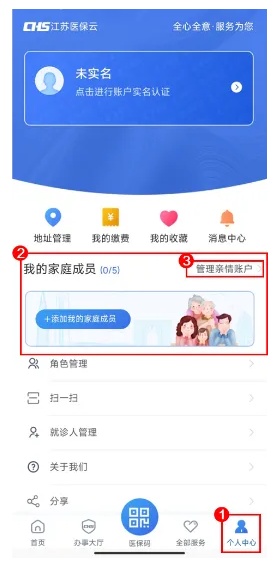 1.打开“江苏医保云”APP,点击【个人中心】,找到【我的家庭成员】下的【管理亲情账户】即可进入【亲情账户】管理界面