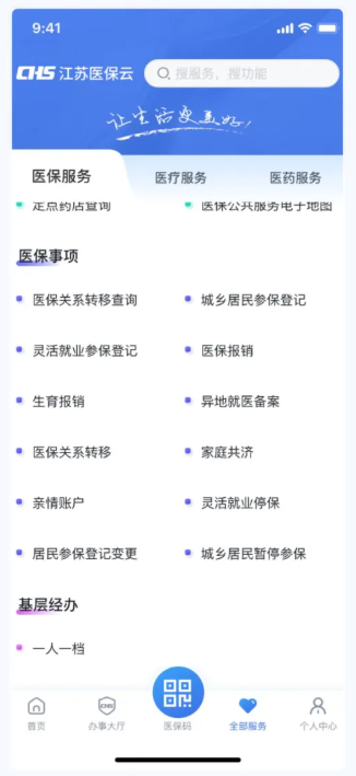 1.打开江苏医保云App,点击 【全部服务】-【医保服务】
