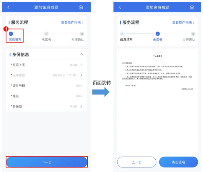 3.进入信息填写页面,首先按照要求补充需要添加的家庭成员信息,补充确认之后点击进入【下一步】