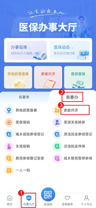 方式二:点击【办事大厅】→【我要办】,在【我要办】页面下找到【家庭共济】即可点击进入