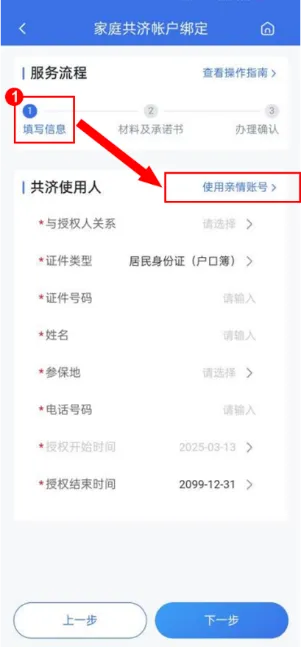 4.在【家庭共济绑定】页面,您将作为授权人,根据页面提示填写共济使用人的基本信息,包括与授权人关系、证件类型、证件号码、姓名、参保地、电话号码、授权开始与结束时间,填完之后点击【下一步】;根据页面提示补充附件材料,并录入电子签名,提交即可完成绑定。