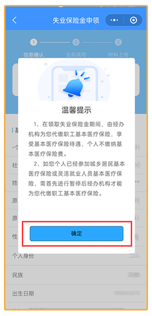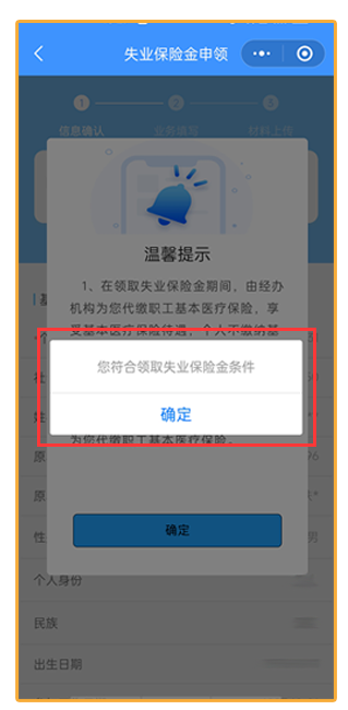 如果符合失业金领取条件系统会弹窗提示您符合领取失业保险金条件,点击确定