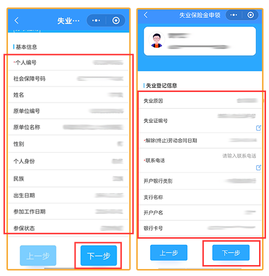 进入失业登记信息界面,录入联系电话,核对银行卡号,点击下一步