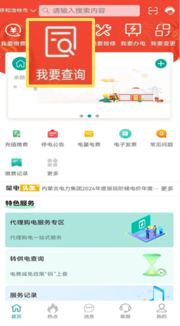 1.登录蒙电e家App,在首页上方点击 【我要查询】