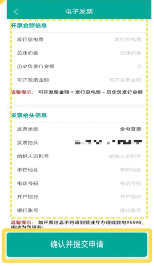 4.确认开票信息无误后,点击 【确认并提交申请】 即可完成发票开具