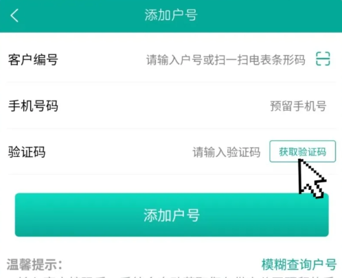 输入客户编号,系统会自动识别户号下已绑定的手机号码,点击获取验证码,输入验证码后,即可完成户号绑定