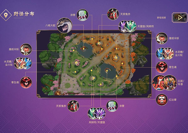 野区地形复杂,视野差,分布着诸多野怪和四大麒麟以及石距、八岐大蛇等BOSS。野区往往是游戏中冲突最激烈的地方。