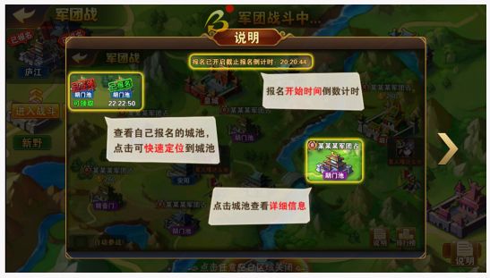 1、军团战开始前十分钟,玩家可进入本军团报名的城池准备战斗。开战后会预留一段时间供军团成员加入战场。