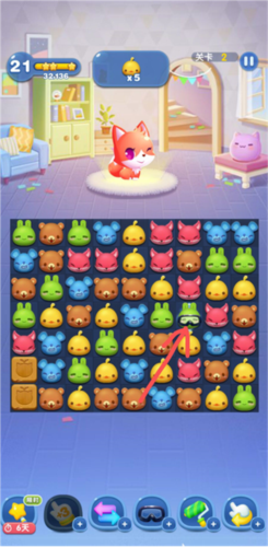 6、在消除的过程中,不能随随便便乱配对,需要小心谨慎,特别是不要错过那些能够凑出特效的步数。当五个同样的动物合成一排的时候会产生一个暴风幽灵,这个幽灵和任意一个头像互换就可以消灭游戏盘中所有的同类图标。