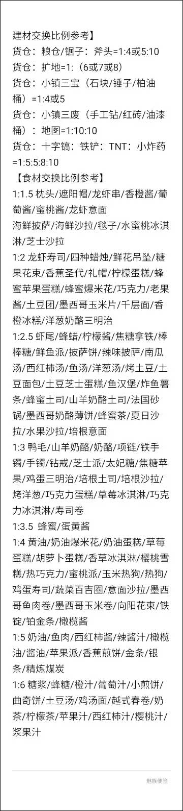 可以升级的建筑有很多,需要的材料不尽相同。为了促进玩家的交换,游戏内部有设定玩家将会易于获得其中的一部分道具,而不易获得的大部分道具就要靠交换来集齐了。