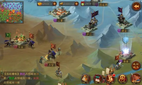成功地将策略性定为国战玩法的重要标准。玩家可以兵分三路,不断突进攻城,也可以用外交手段联合盟友,左右夹击强敌,方面玩家在指尖上随时随地畅享国战乐趣!