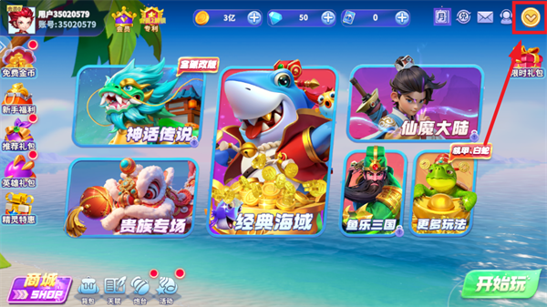 打开捕鱼欢乐炸,进入游戏大厅后点击如图右上角按钮