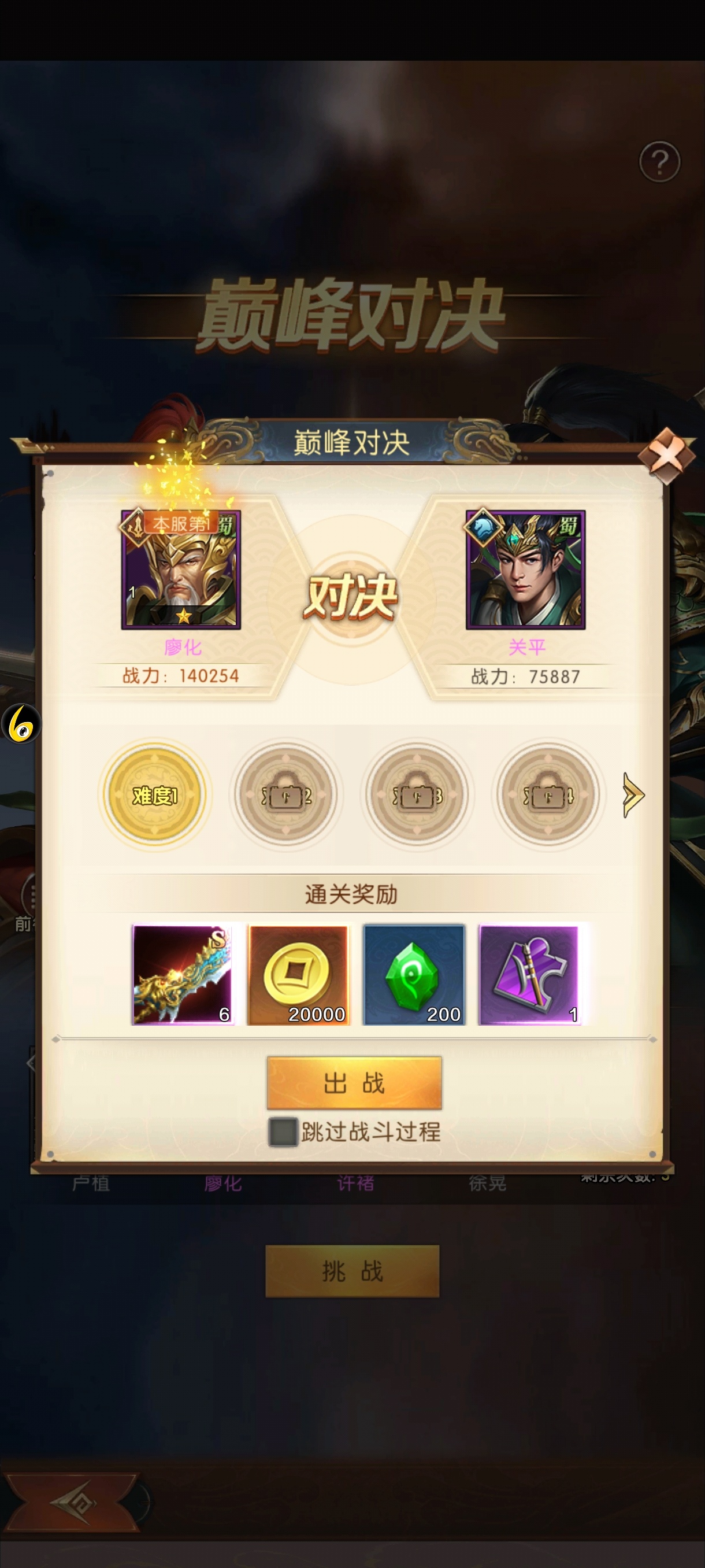 每个武将都可以选择不同难度的关卡来进行对决,但每次只能挑战一个关卡,每个武将都有25个难度关卡难度越高,获得的奖励越丰富,即便没有玩家所需要的武将神器碎片,也可以挑战获取强化材料陨铁,以及对应资质的武将神器碎片。