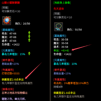 每一条专属项链都会鉴定一次幸运1-8,配合武器+7,可触发幸运加倍攻属性。倍攻配合幸运打的伤害和回血量就会越高。