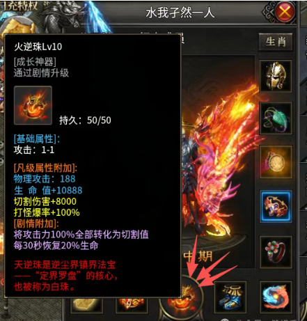 (注意:天逆珠贯穿游戏始终,属于成长型法宝,需要依次收集水-火-土-木-金-阴-阳,达到阴阳五行圆满发挥它最大的功能,二大陆是天逆珠吸收属性的第一步,后面随着游戏探索可以做收集类的剧情、击杀指定怪物等为天逆珠附加各种各样的强力属性)