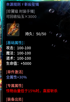 斩杀镯带有超高的全属性+残血斩杀,属于追梦级别【值点米-鞭尸需要配合斩杀手镯才能斩杀!】