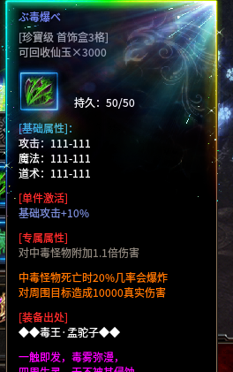 属于一件不起眼的终极专属,打BOSS神器,除了特殊怪不能麻,其他任何怪都能直接控住。