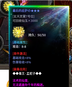 2、最后的庇护,加8%的伤害吸收,这个装备在前中期开荒也很大的作用。