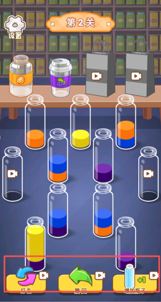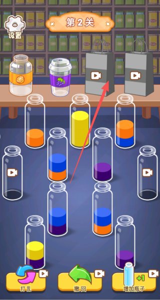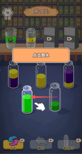 1、点击装有液体的瓶子,将同颜色的液体倒入空瓶或对应颜色的瓶子中进行消除。