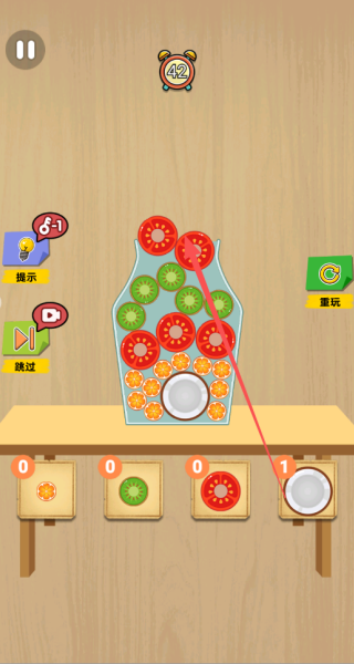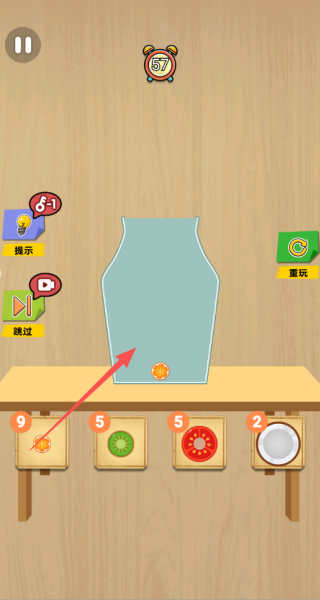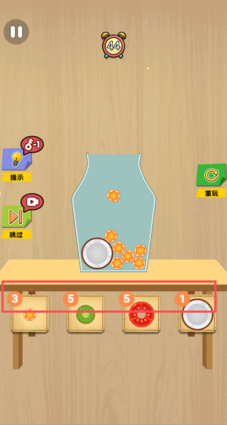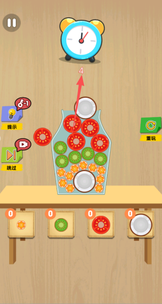 3、装入水果后轻轻摇晃瓶子让水果更紧凑地排列,消除空隙以容纳更多种类,每一次成功填满都是对逻辑思维的完美验证。