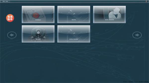 1、首先在本站下载并打开TRS火车模拟器(内置模组版),进入主页后你可以看到5个不同的选项,分别是教程、路线、存档、模型广场以及额外内容,同时在屏幕左侧还可以看到“虫虫助手”按钮。