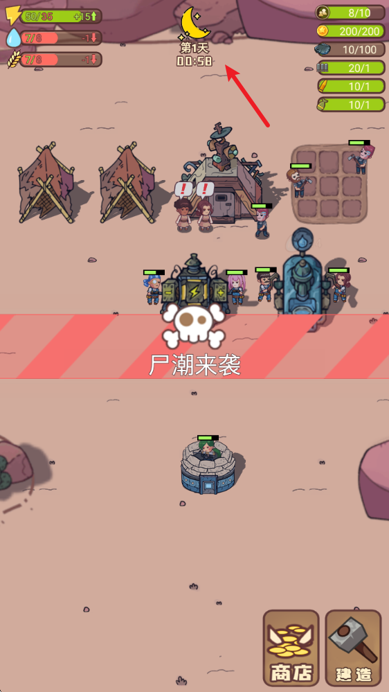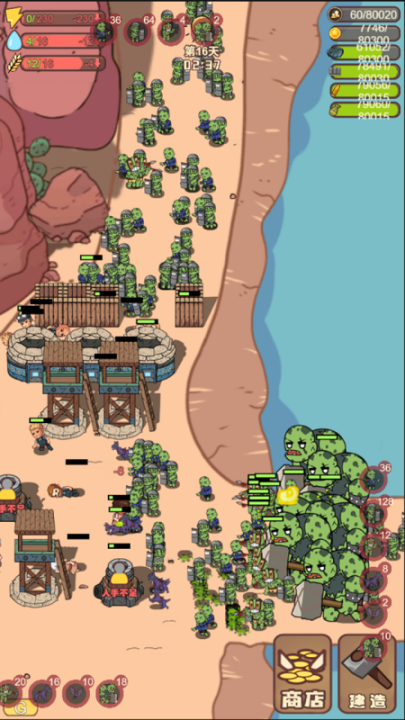 3、晚上会有不断来袭的尸潮,玩家需要合理的去布置防线,并指派居民来驻守,建造起固若金汤的防御。