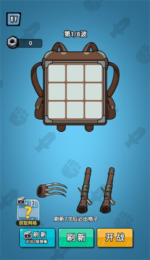 2、进入关卡后玩家需要将初始武器放入背包里的格子,相同的武器可以合并来提升等级,点击刷新可以获得新的武器。