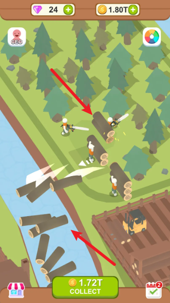 1、开始游戏后,我们需要派遣工人进入到森林中伐木,然后将树木扔到小溪中运输。