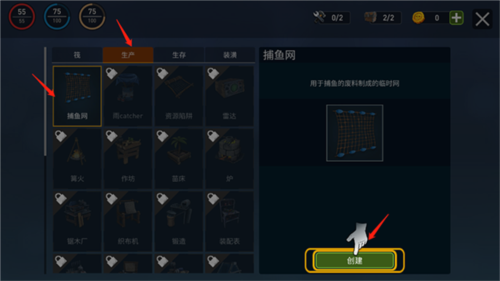 5、打开海洋游猎生存游戏中的工艺菜单,就能设置捕鱼网获取食物;