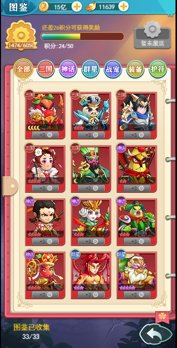 图鉴类型包括英雄(三个派系)、战宠、装备、护符,在首次获得他们或者进行升星后可领取积分
