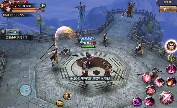 和罗汉阵副本单一挑战不同,亦道峰副本中,玩家需要依次接受少林、明教、峨眉、武当四个门派的挑战。每个门派都有2波攻势,2波攻势过了之后还要挑战门派BOSS,分别是:少林圆真、明教张无忌、峨眉灭绝师太和武当张三丰。