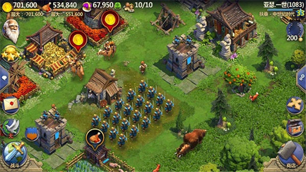 玩家可通过副本征伐,联机掠夺等战斗形式去获取大量资源,发展文明。最让人期待和热血沸腾的便是联盟战斗玩法了。